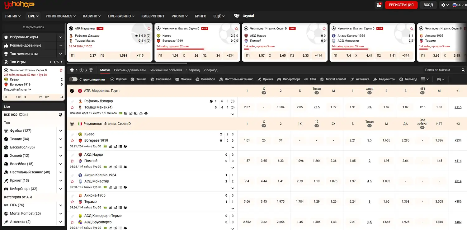 В Yohoho Bet доступно более 25 видов спорта, включая футбол, теннис, баскетбол, хоккей, бокс/MMA, волейбол, крикет и киберспорт. Футбол занимает центральное место: в линии представлены матчи АПЛ, Серии А, Ла Лиги, Лиги чемпионов, а также азиатских лиг — корейской K League, японской J1 League, Лиги чемпионов АФК.