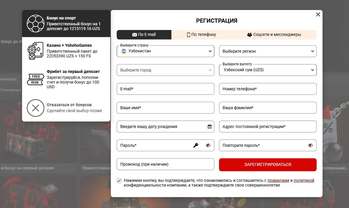 Регистрация в Yohoho Bet занимает не более 3–5 минут. Доступны следующие способы:
