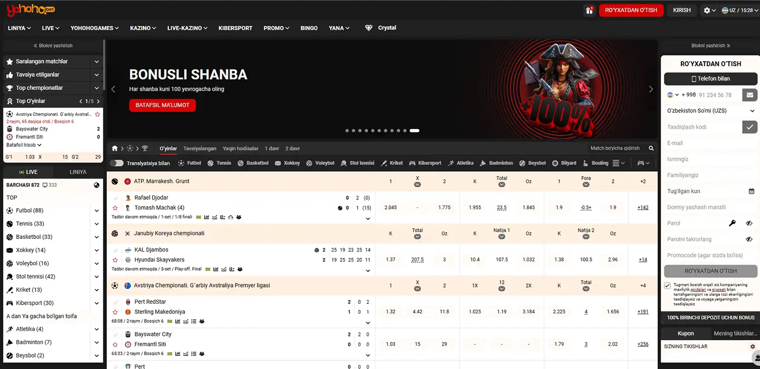 Yohoho Bet — новый бренд, запустившийся в 2025 году и стремительно набирающий популярность среди узбекских игроков. Платформа работает на лицензии Кюрасао, предлагает ставки на спорт и онлайн-казино и поддерживает местные платёжные системы Uzcard, Humo, Click и Payme.
